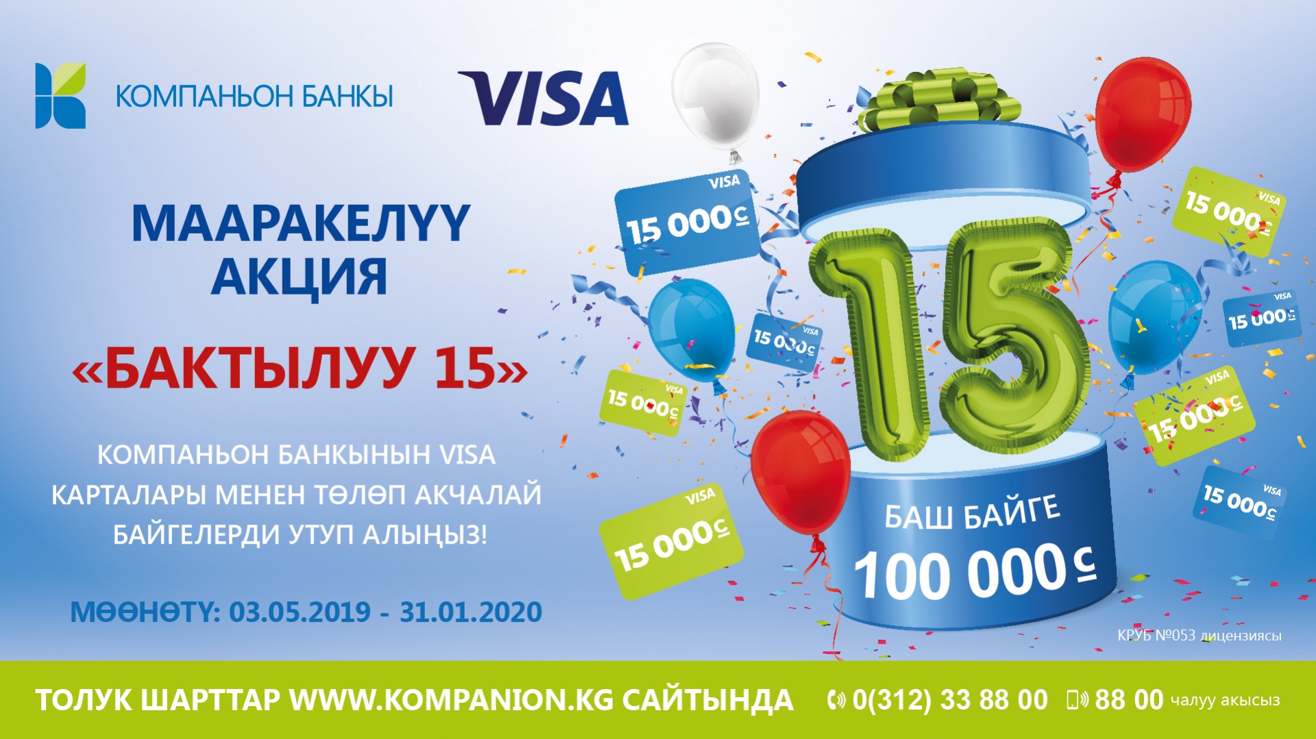 Бардык сатып алууларды «Компаньон Банкы» ЖАК VISA төлөм карталары менен жүргүзүп, «Бактылуу 15» акциясына катышып жана 100 000 сом утуп алыңыз!