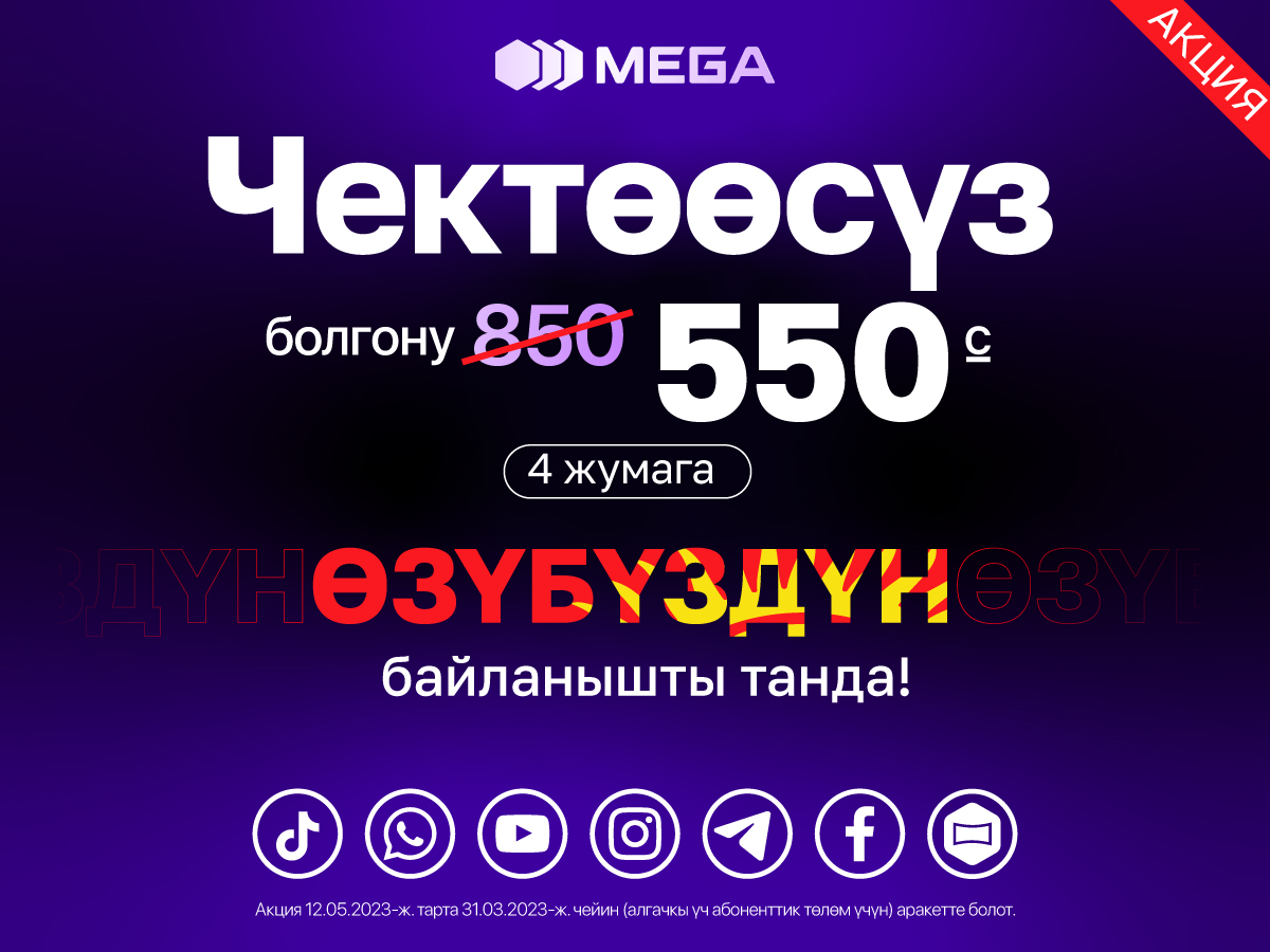 - MEGA түйүнүндө чектөөсүз чалуулар жана SMS’тер;