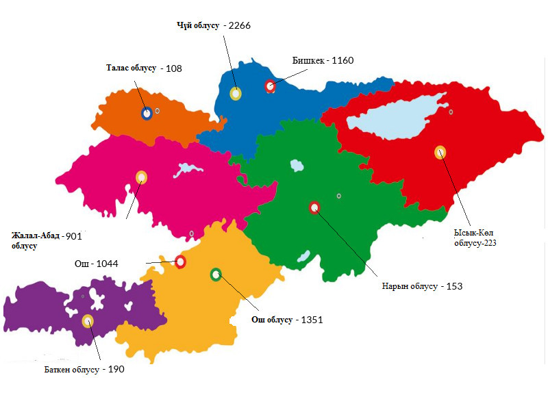Чүй облусу – 2266 ВЖА; Бишкек – 1160; Ысык-Көл облусу – 223; Нарын облусу – 153; Ош облусу – 1351; Баткен облусу – 190; Ош – 1044; Жалал-Абад облусу – 901; Талас облусу – 108;
