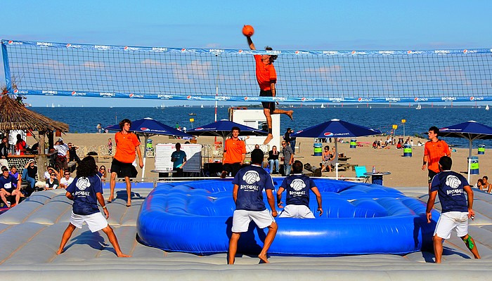Пляж волейболун ойноп жүргөндөр бийик секирип, күч менен топ чаап упай топтосом деп кыялданса керек. Мындай кыялды орундатуу баардык эле волейбол оюнчусунун колунан келе берчү иш эмес. Бирок Бразилядагы кенен жайылган боссабол оюнун ойноо учурунда бул кыялды кадимки эле катардагы жөнөкөй оюнчу аткарып коюшу ыктымал. Анткени бул спорттун түрү үчүн атайын чабуулчуга арналган батут орнотулган.