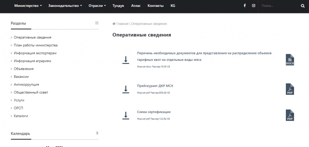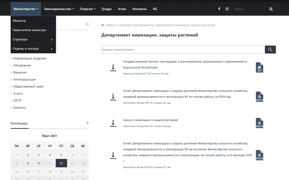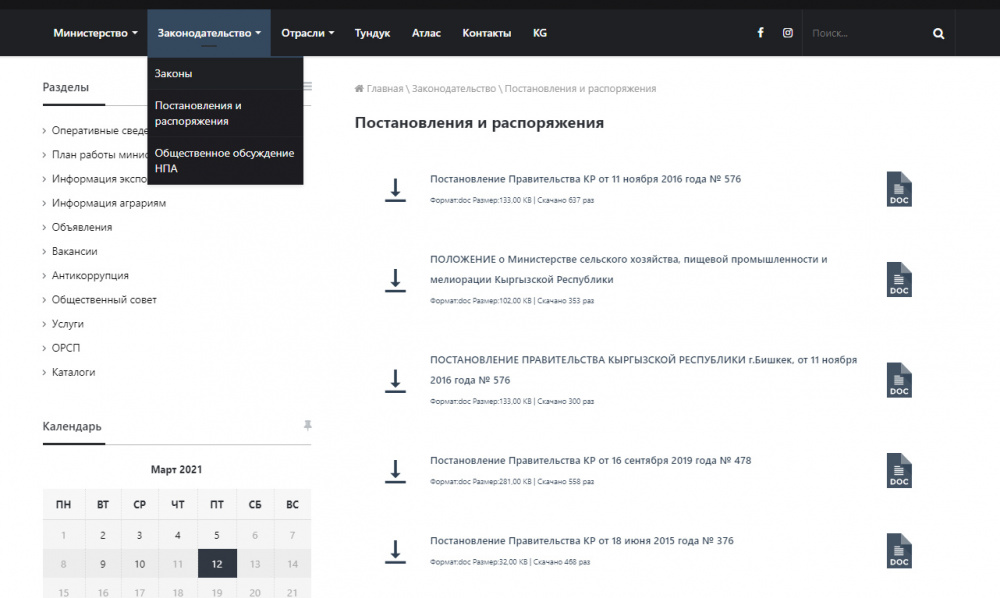 Ченемдик укуктук актыларды дагы жүктөп алууга болот. Бирок тармактары бар бөлүм таптакыр жараксыз. Ал жерде 2019-жылдын отчеттору гана бар, дыйкандар үчүн пайдалуу эч нерсе жок.