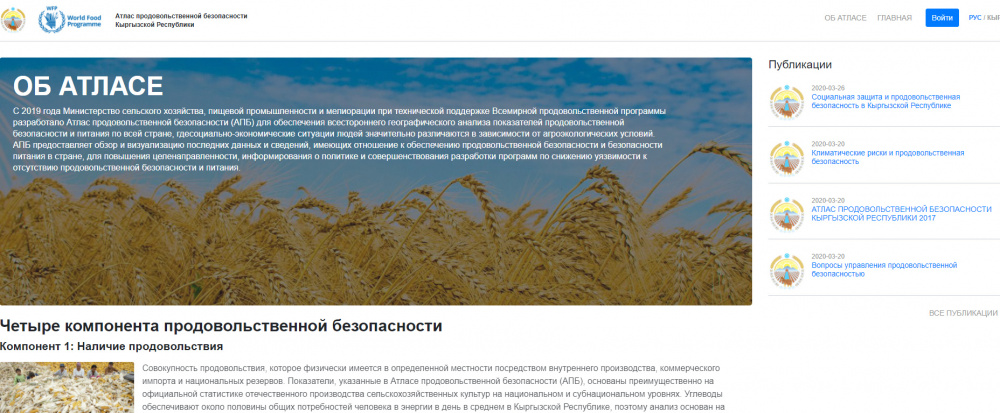 Негизги менюда БУУнун Бүткүл Дүйнөлүк азык-түлүк программасынын колдоосу менен түзүлгөн- «Тундук» жана «Азык-түлүк коопсуздугунун Атласы» ресурстарына шилтемелер бар.