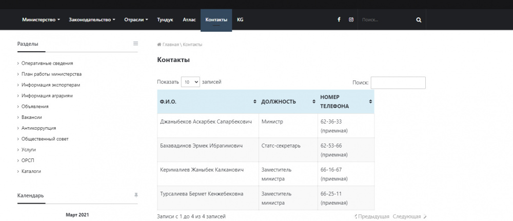 Министрлик жөнүндө бөлүмдөн министрдин жана анын орун басарларынын өмүр баяны менен таанышууга болот, ошондой эле бөлүмдүн түзүмүн көрүү мүмкүн. Эгерде департаменттин аталышын бассаң, анда аны менен байланышкан документтерге: отчетторго, мыйзамдарга, дыйкандар үчүн маалымат материалдарына өтөсүң, аларды жүктөөгө болот. Бирок бөлүмдөрү бар бөлүм бош.