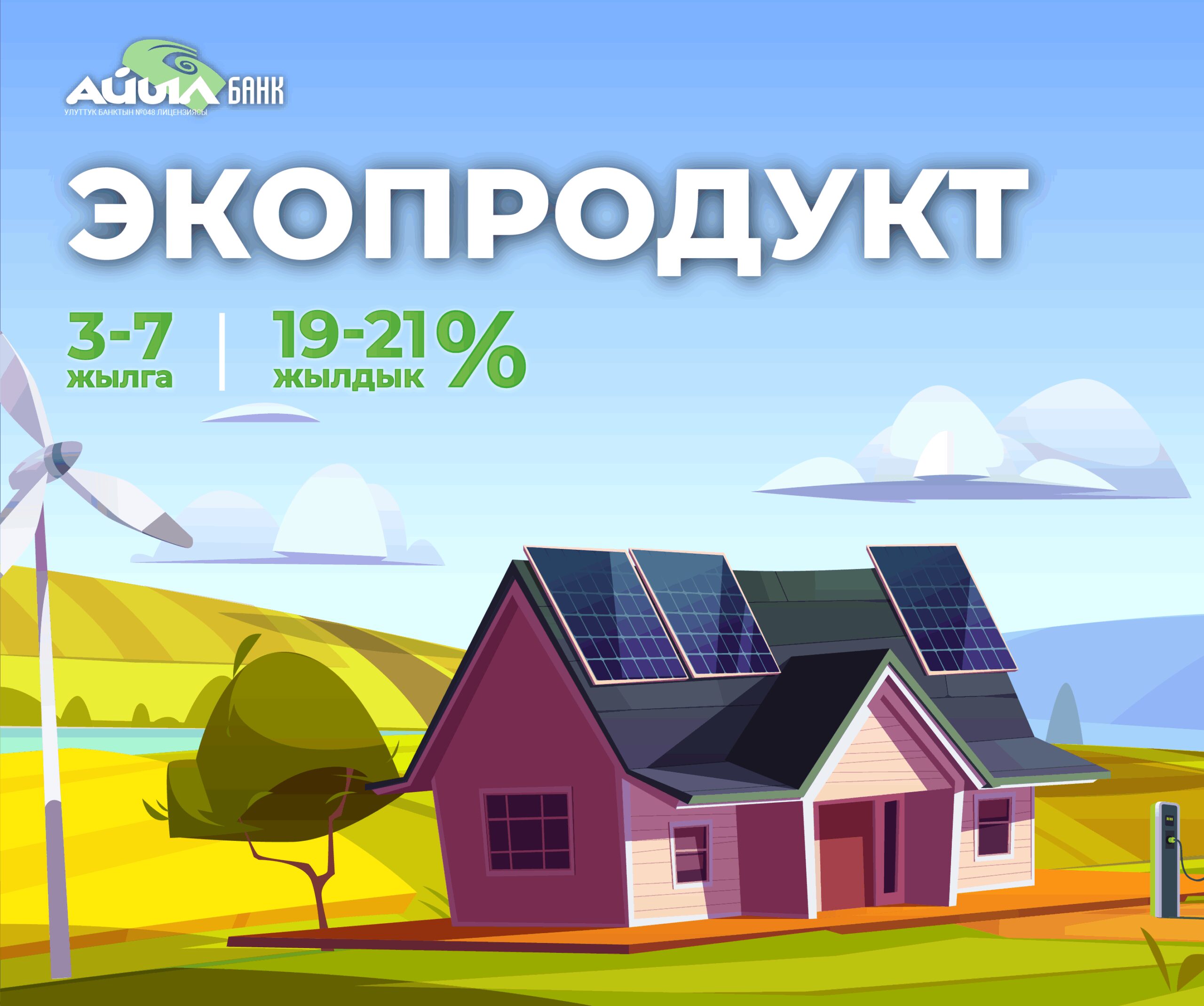 “Айыл Банк” ААКсы “Экопродукт” өздүк продуктусунун эсебинен жаратылышка зыян келтирбей, экологиялык накта азыктарды чыгарган ишкерлерди каржылык колдоо максатында, пайда алып келген иш багыттары, ошондой эле калктын керектөөлөрү үчүн кредит берүүдө.