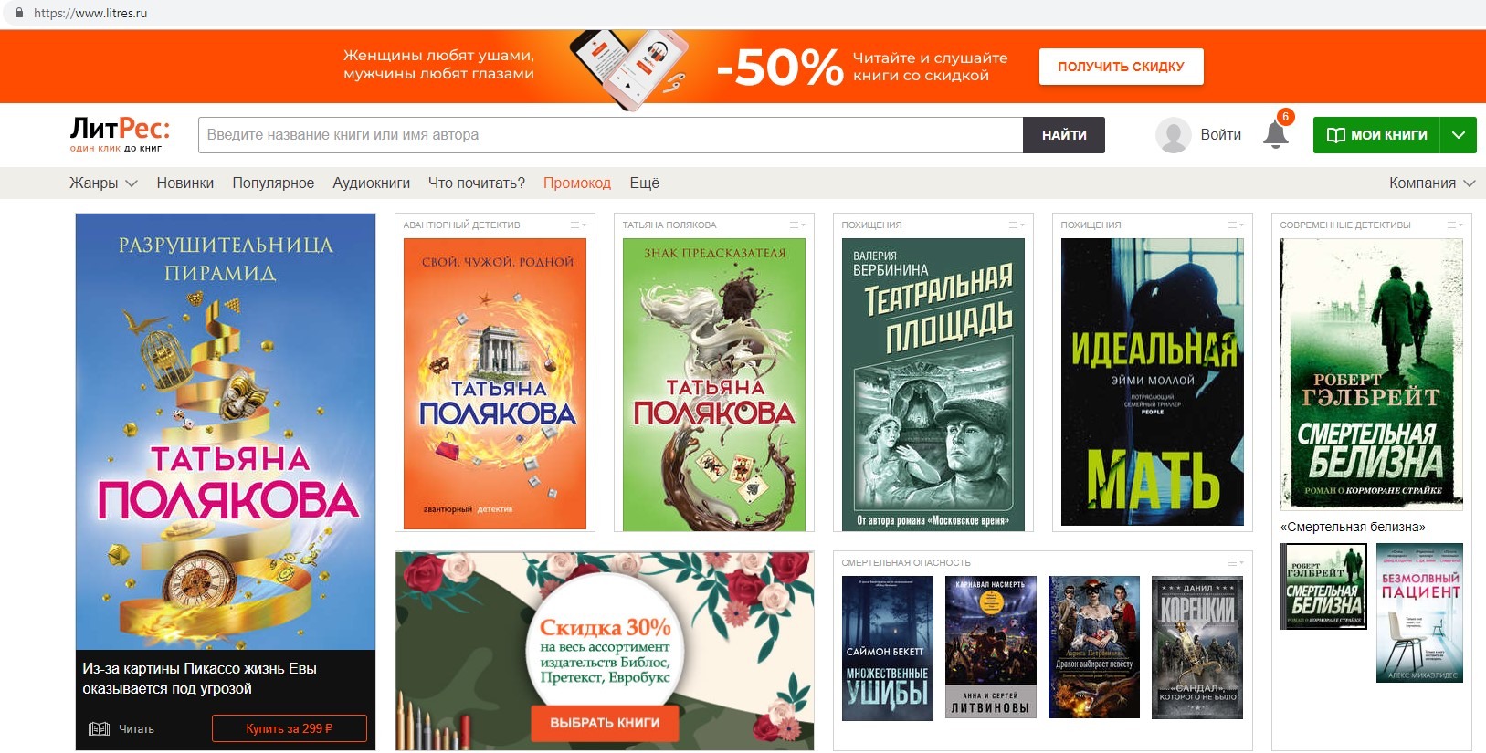 ЛитРес китепканасы ири онлайн-китепканалардын тизсмесине кирет. Учурда сайтта болжол менен 875,000 китеп бар, анын 32 000ден ашууну бекер.