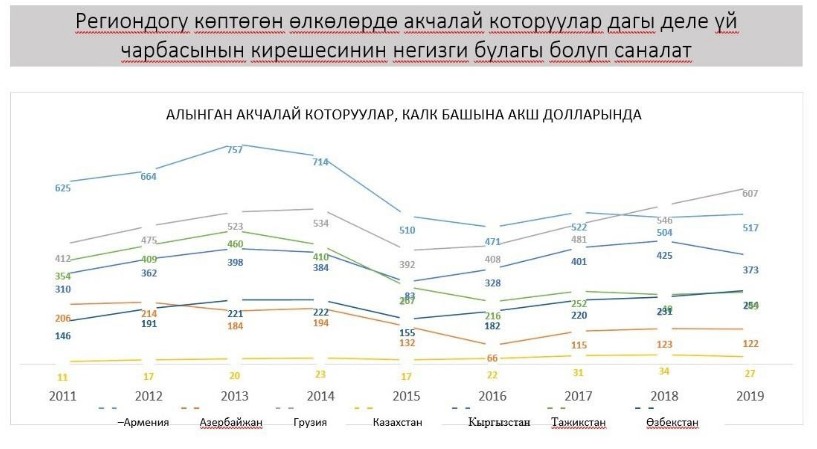 Эл аралык эмгек уюмунун эксперттери “Эмгек миграциясы жана жумушсуздук” веб-семинары үчүн презентациясында төмөнкүдөй сандарды келтиришет: 2019-жылы Кыргызстанда мигранттардан түшкөн которуулар калктын киши башына 373 долларды, 2018-жылы — 425 долларды түзгөн: