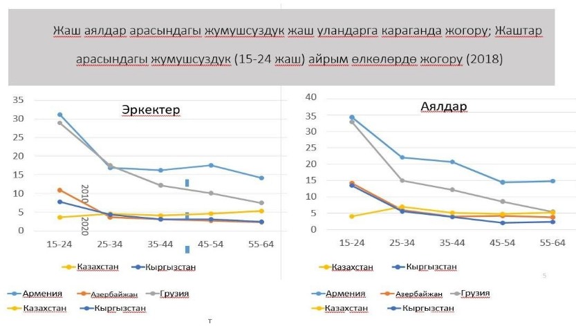Бул тенденция азыркы учурда дагы сакталып келүүдө. Жалпысынан, 15тен 29 жаш курагындагы улан-кыздардын жумушчу күчүнүн курамында катышуу деңгээлин баалоо менен, Эл аралык эмгек уюмунун эксперттери мектепке барбаган эркектер аялдарга караганда жогору жана бул көрүнүш Кыргызстан үчүн да мүнөздүү деген жыйынтыкка келишкен.