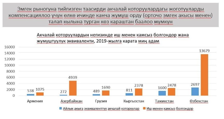 ЭЭУнун эксперттери 2019-жылы башталган экономикалык каатчылыктан улам Кыргызстандын 811 эмгек мигрантынын жоготкон акча которууларын компенсациялоо үчүн өлкөдө 2 378 жумуш ордун түзүү керек деп эсептешет. Төмөндө келтирилген слайддан Кыргыз Республикасынын башка өлкөлөргө карата абалын баалоого болот: