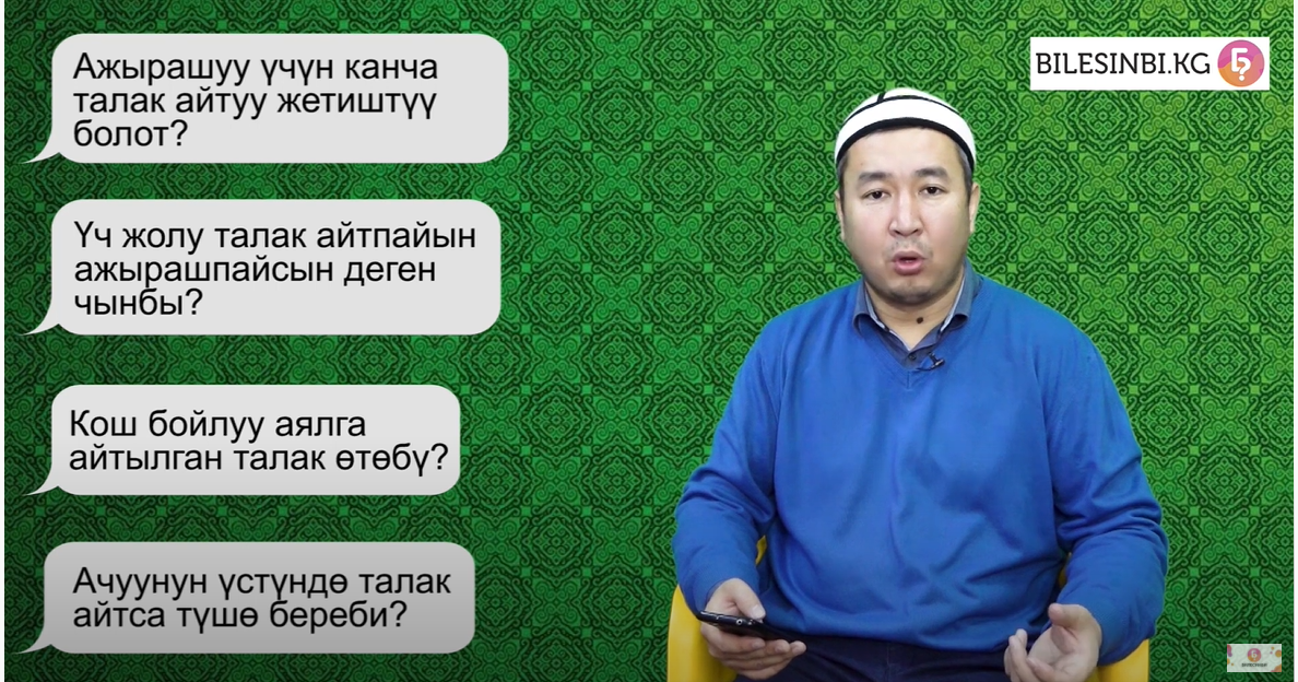 Этек кири келип жаткан аялга талак өтөбү? Кош бойлууларга талак айтса болбойбу? Үч талактан кийин никени жаңыртууну жолу барбы? Бул жана башка суроолорго Кыргызстан мусулмандарынын дин башкармасынын фатва бөлүмүнүн адиси Бактияр Токтогазиев жооп берди. Ал эми даарат тууралуу бул жерден көрсөңүз болот.