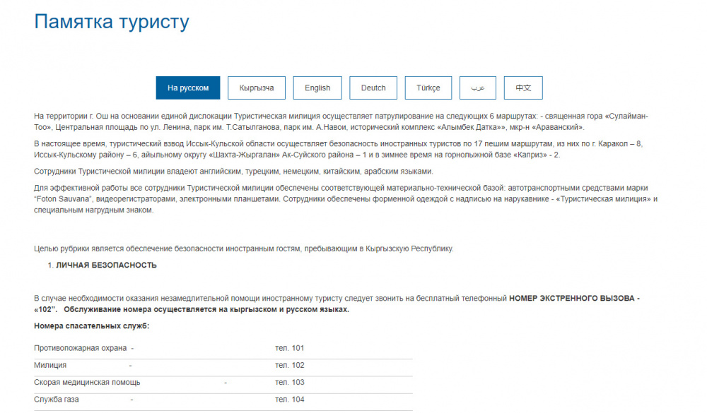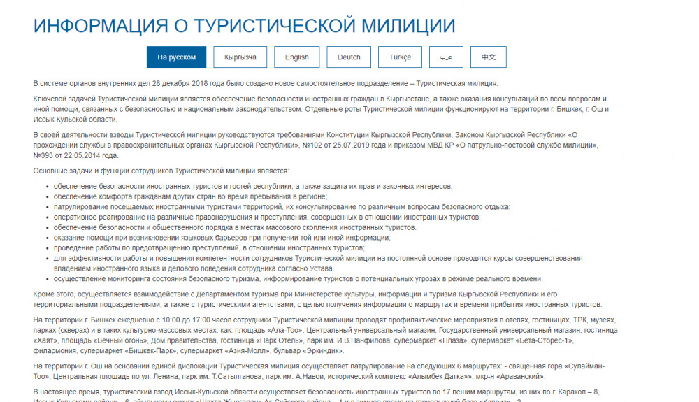 Туристтик милиция бөлүмүндө эң пайдалуу нерсе — бул байланыштар, ошондой эле туристтик милиция жөнүндө бир нече чет тилдерде маалыматтар.