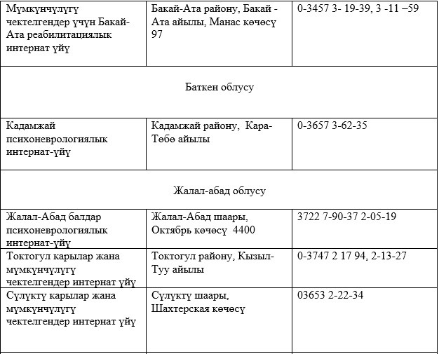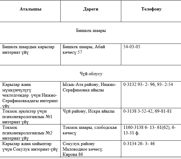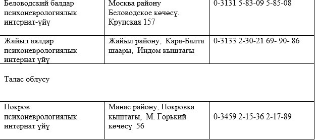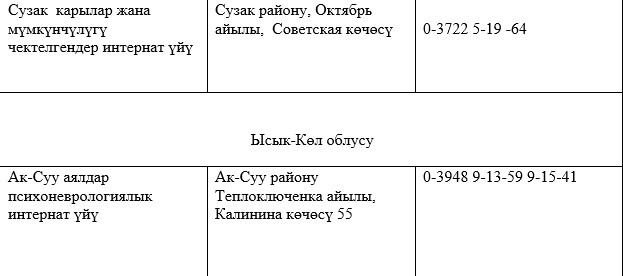 Кыргызстанда социалдык жардамга, кароого жана такай багууга муктаж болгон мүмкүнчүлүгү чектелгендер, майып балдар, улгайган кары-картаңдар үчүн атайын мекемелер бар. Айтылуу мекемелердин даректери жана кабыл алуу шарттары туралуу Социалдык өнүгүү министрлигинин алдындагы Социалдык камсыз кылуу департаментинин мүдүрү Нурдөөлөт Базарбаев маалымат берди.