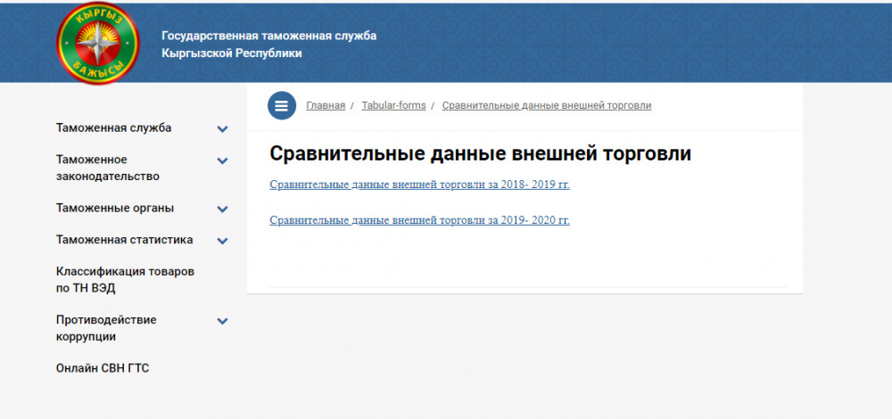 Тышкы сооданын абалы боюнча статистикалык маалыматтар бар, бирок 2019-2020-жылдарга гана. «Аналитикалык материалдар» бөлүмүндө Word программасында эки гана файл бар, «Таблица формасы» кошумча барагынан — Excelдеги өлкөлөр боюнча статистиканы таба аласың.