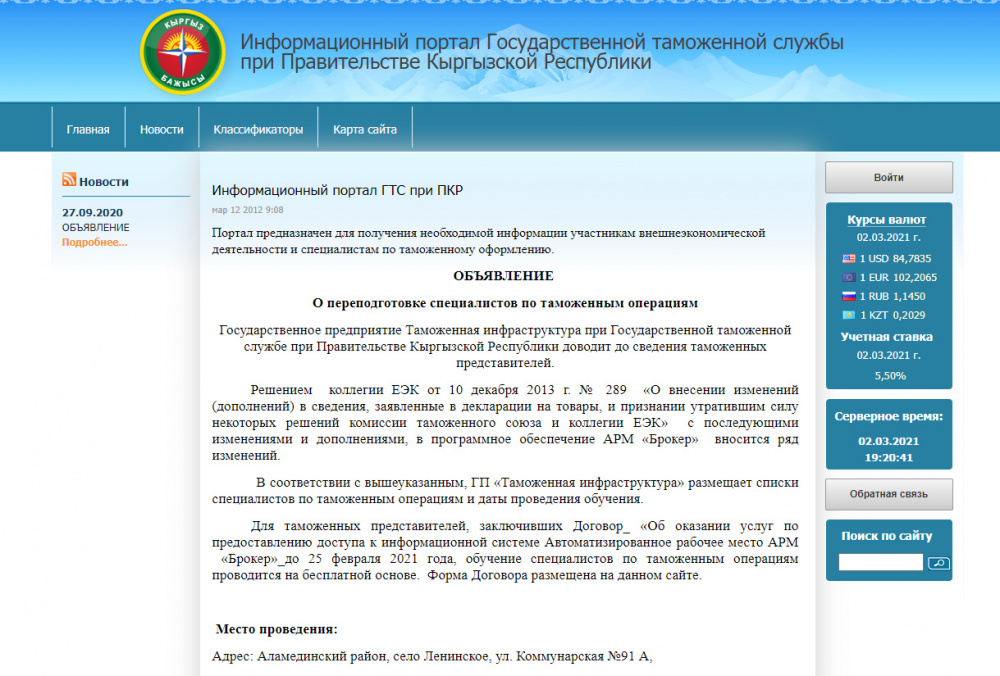 МБКнын сайтынын оң тилкесинде ЕЭК сайтына өтсө болот, 2012-жылдын билдирүүлөрүнө шилтемелер бар («Кыргыз Республикасынын бажы кызматынын БАЭАнын тышкы порталы»), анда учурдагы алмашуу курстары бар. Маалымат порталындагы классификаторлор актуалдуу болушу мүмкүн, бирок башкы беттеги билдирүү колдонуучулардын башын айландырат. Ошондой эле оң тилкеде иштебей турган «ЕАЭБдеги товарларга алдын-ала кабарлоо» бөлүмү бар.