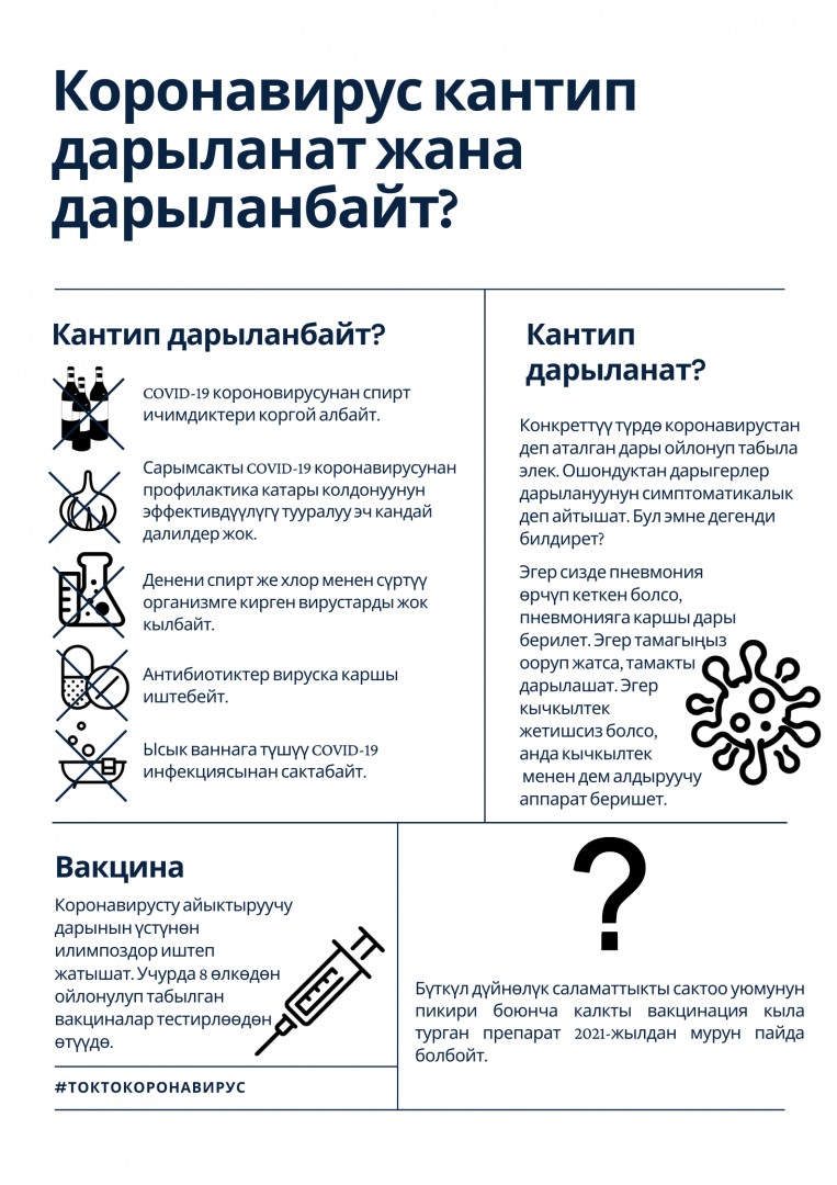 COVID-19 короновирус кантип дарыланат жана дарыланбайт экенин төмөндөгү графикадан биле аласыз.