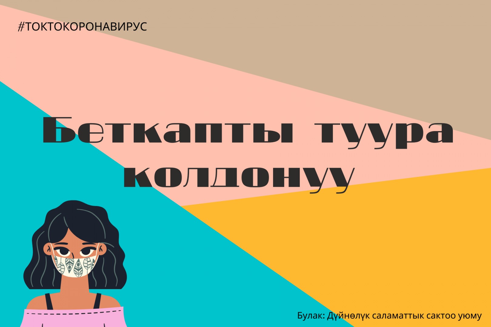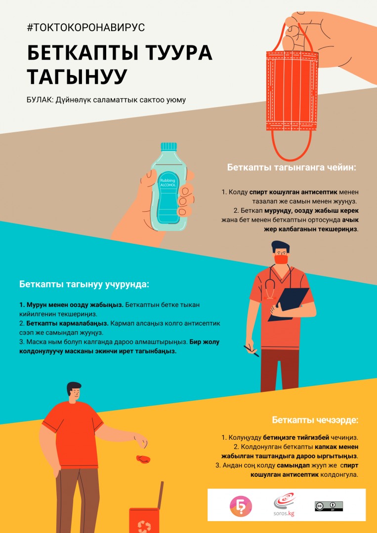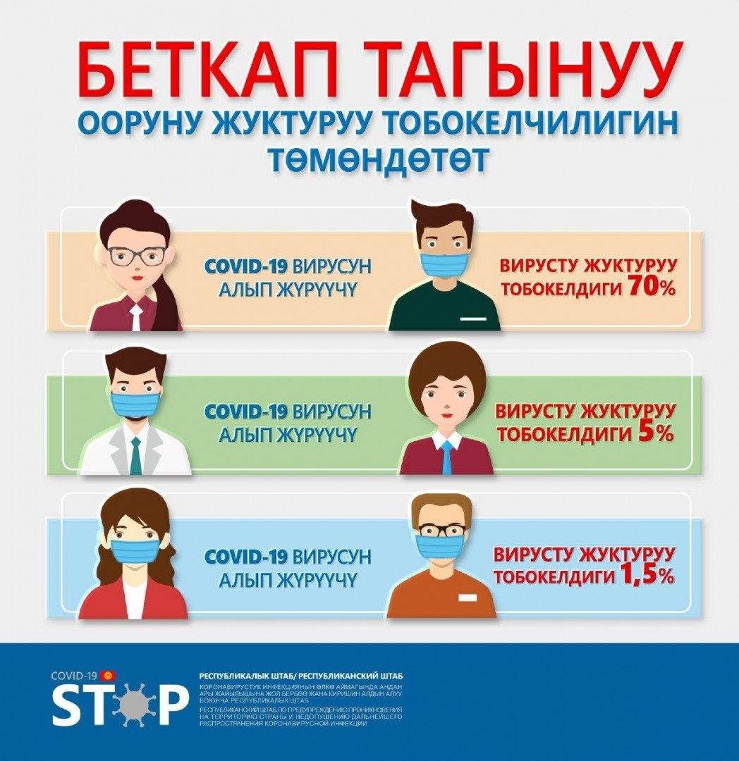 Бүткүл дүйнөлүк саламаттыкты сактоо уюму жаңы рекомендацияларды жарыялады. Андаа бет кап тагынуу (медициналык же кездемеден тигилген) 100% жугузуу коркунучунан коргойт деп айтуу мүмкүн эмес. Бирок маска инфекцияга туш болуу кокустугун кыйла төмондөтөт. Жугузуп алсаңыз деле, оору женил формада өтүп, кийинки жашоого көп кесепети тийбейт.