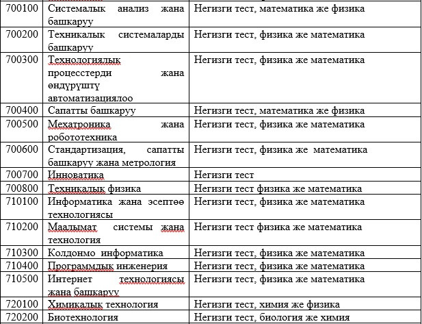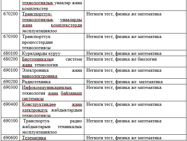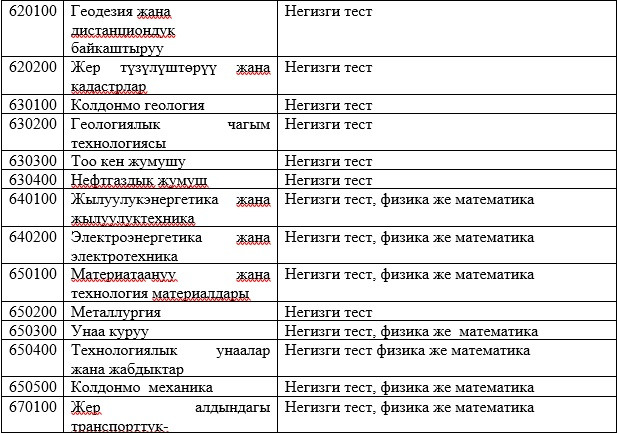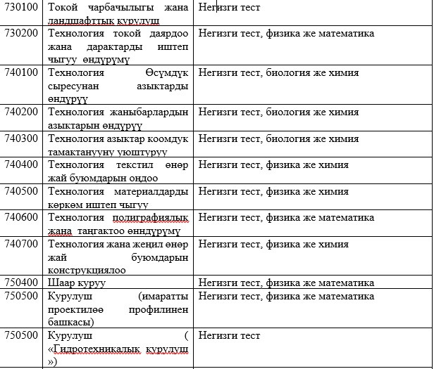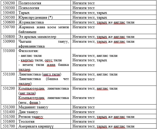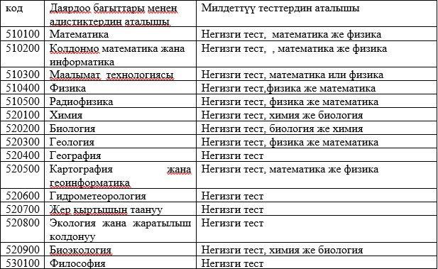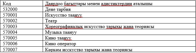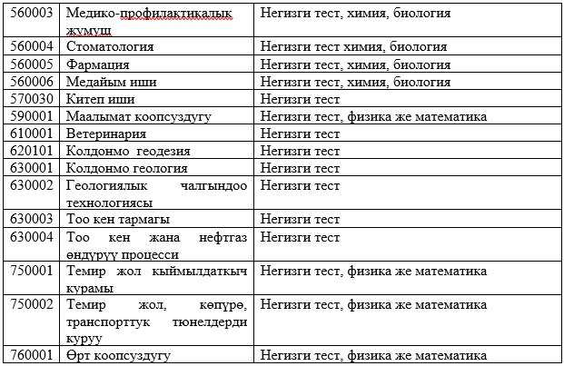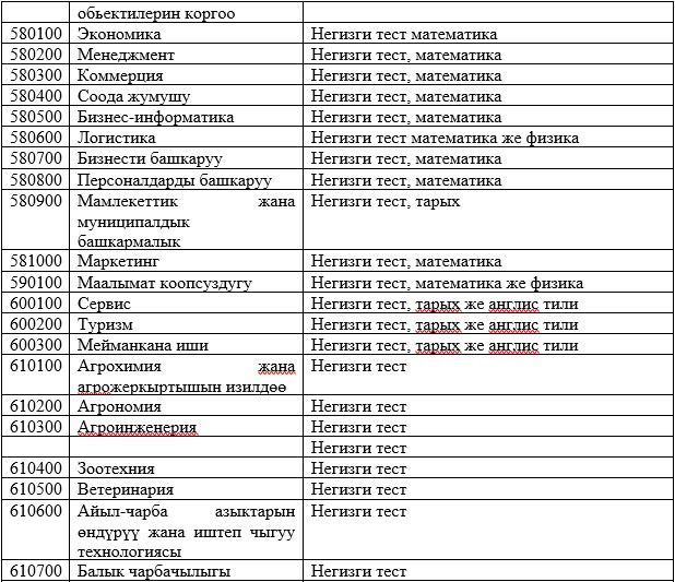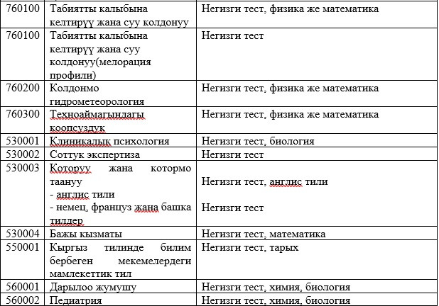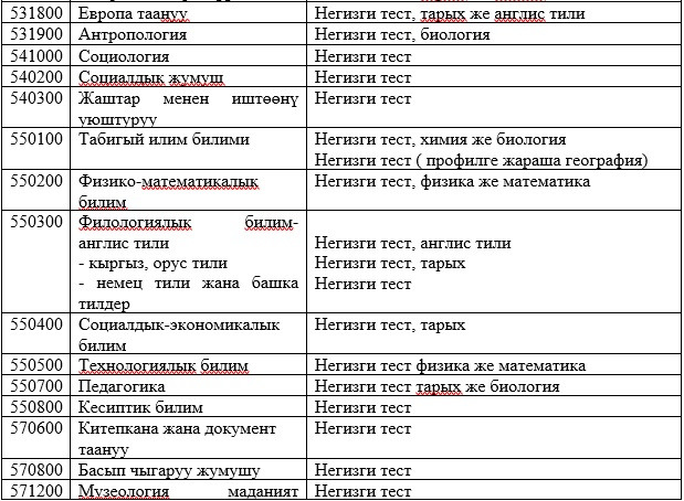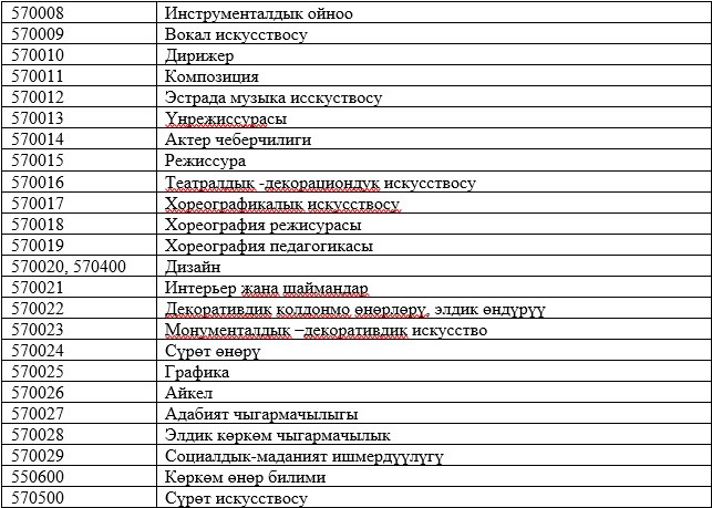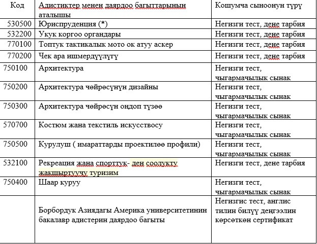 Абитуриенттерди окууга кабыл алууда жалпы республикалык тестирлөөнүн жыйынтыктары керек болбогон даярдоо багыттары менен адистиктердин тизмеси: