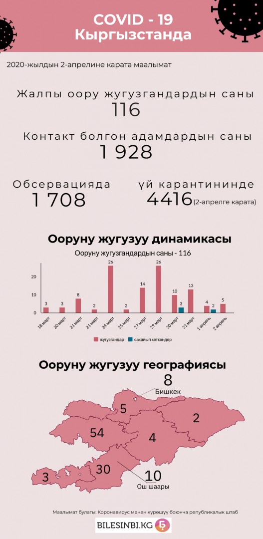 2-апрелге карата коронавирус жугузгандардын саны дагы 5 адамга көбөйдү. Бул тууралуу бүгүн Саламаттыкты сактоо министрлигинин ыкчам штабынын жетекчиси Касымбек Мамбетов билдирди. Бардыгы болуп 116 адам.