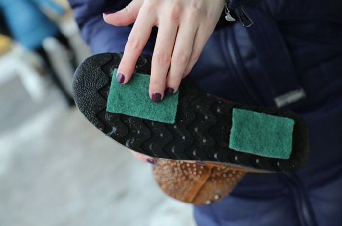 Дарыкандан кездеме лейкопластырдын рулонун сатып алып, 3-4 см кылып кесип, бут кийимдин таманын тазалап, кургатып чаптап коюңуз. Эсиңизде болсун, эриген кар менен басууга болбойт.