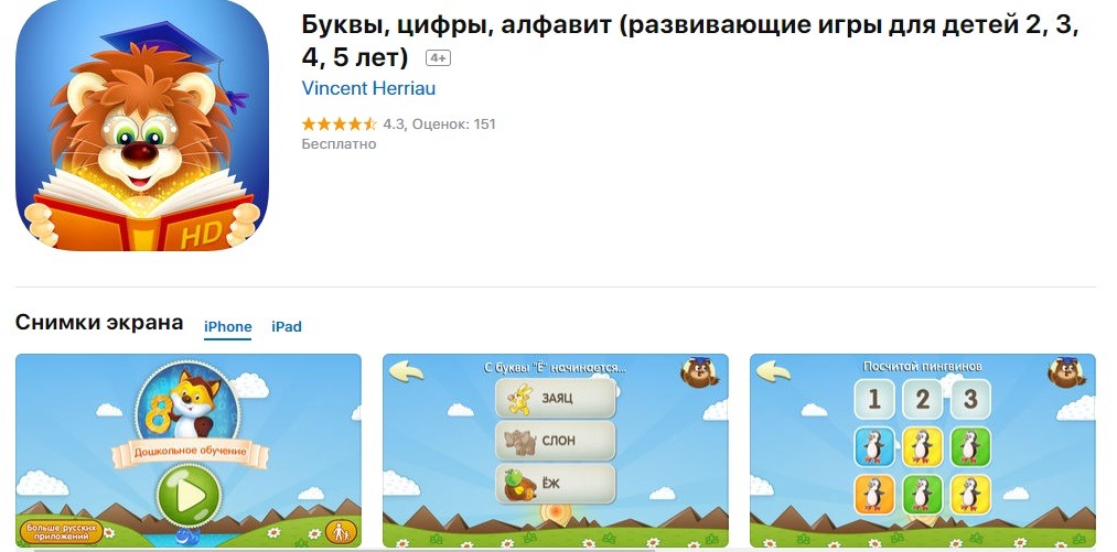 «Буквы, цифры, алфавит» – тиркеме тамгаларды, арифметиканы үйрөтүүчү, эс тутум менен көңүл коё билүүнү калыптандыруучу бир нече майда оюндардын топтомун камтыйт.