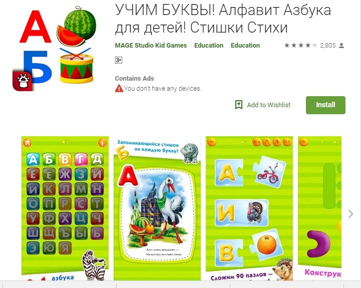 “Учим буквы!» – мектепке чейинки балдар үчүн тамгаларды жана тез арада окуганды үйрөтүүчү интерактивдүү алиппе.