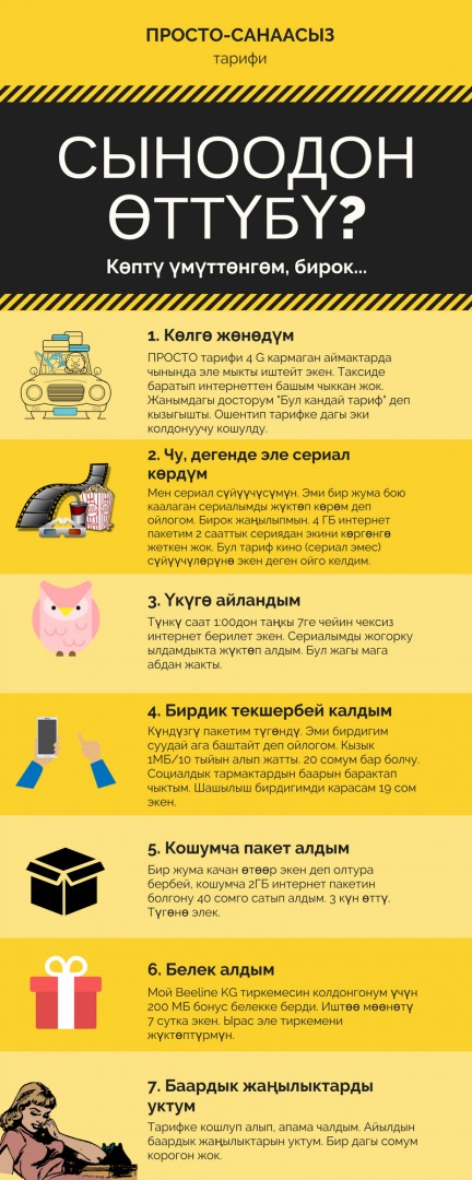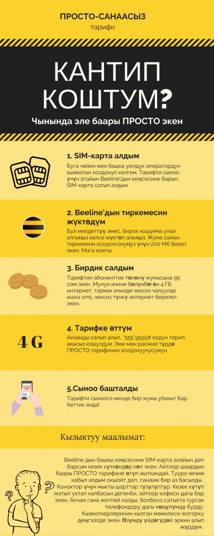 Жарнамалардан тынбай берилип жаткан Beeline’дын “Просто” тарифинин кереметтин сынап көрмөкчү болдум. Бир жума бою тарифти пайдаланып, төмөнкү жыйынтыкка келдим.