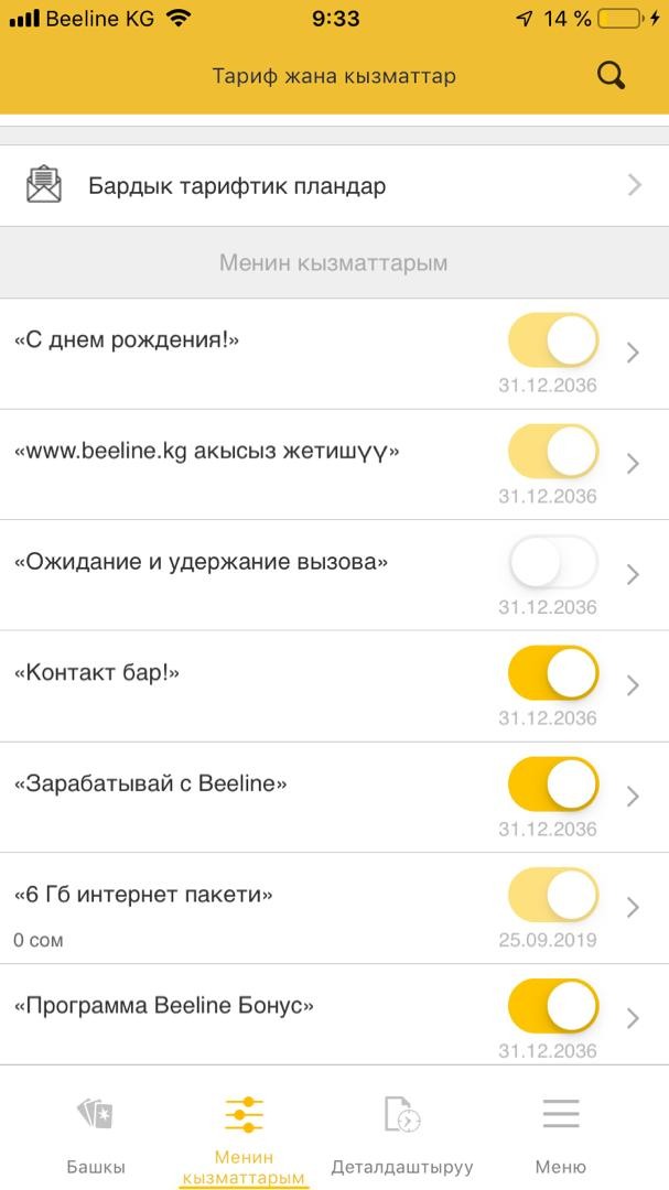 Менюда тарифтер, балансты толуктоо, кошумча кызматтар ж.б бар.