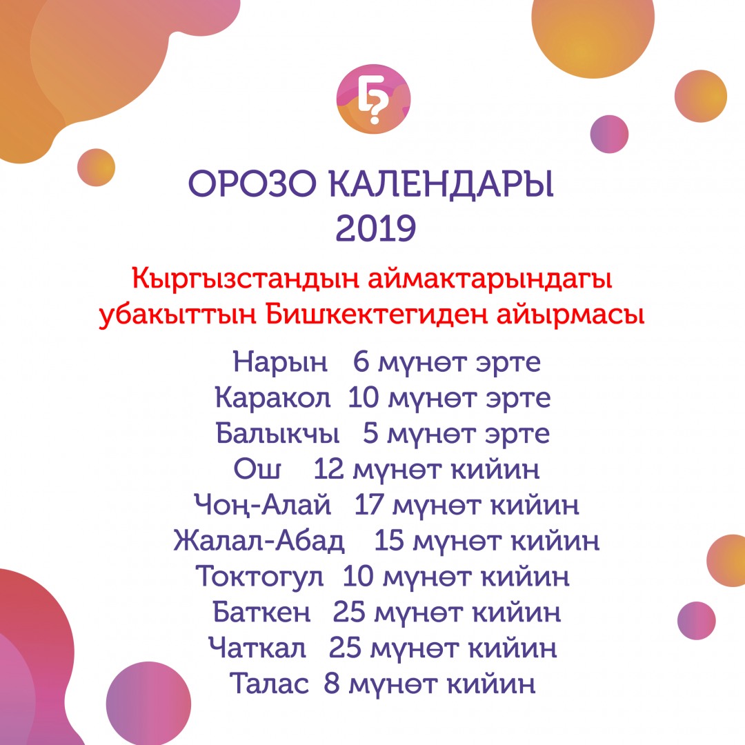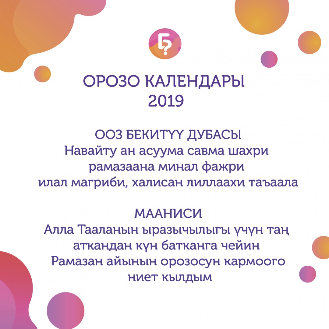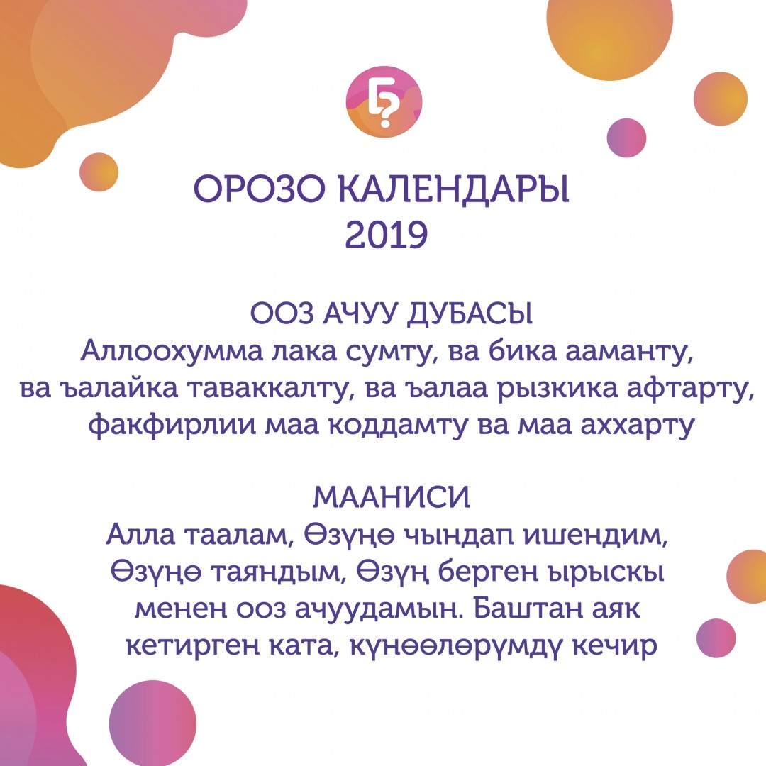 Быйылкы жылы Орозо айы 6-майда башталат. Bilesinbi.kg окурмандарына орозо календарын сунуштайт.