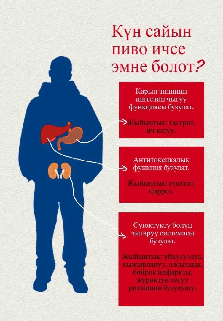 Сенин денеңде антидиуретикалык гормон бар. Ал организмиңе суюктукту кармап турууга жардам берет. Пиво бул гормондун бөлүнүп чыгышын жайлатат. Натыйжада, пиво ичкенден кийин бат-баттан дааратканага чуркайсың, бөйрөгүң жабыркайт, суусузданууга (обезвоживание) чалдыгасың.
