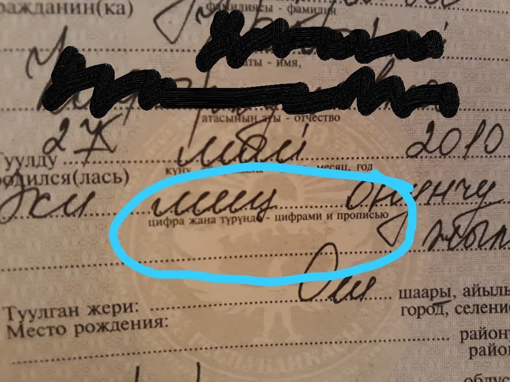 Саламатсызбы. Сиңдилеримдин күбөлүктөрү туура эмес жазылып калыптыр. 2008, 2010-жылдары туулган. Катасын эми көрдүк. “ЦИФРАМИ И ПРОПИСЬЮ” деген жери “ЦИФРА ЖАНА ТҮРҮНДӨ” деп жазылыптыр. Эмне кылсак болот?