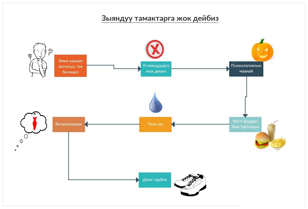 Алдыга максат коюңуз. Бир айда канча килограмм арыктагыңыз келет, жазыңыз. Кыялыңыздагы келбеттин сүрөтүн таап, чыгарып алыңыз. Баш тарткан азыктарды жегиңиз келсе, ошол сүрөттү карап, окшошууга аз калганын элестетиңиз.
