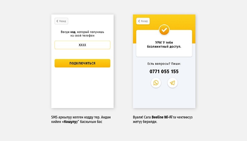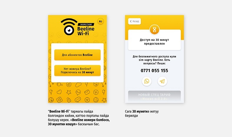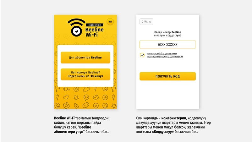 Болгону камтуу аймагында болуп, «Beeline Wi-Fi» тармагын тандоо жетиштүү. Андан кийин каттоо порталы пайда болот.