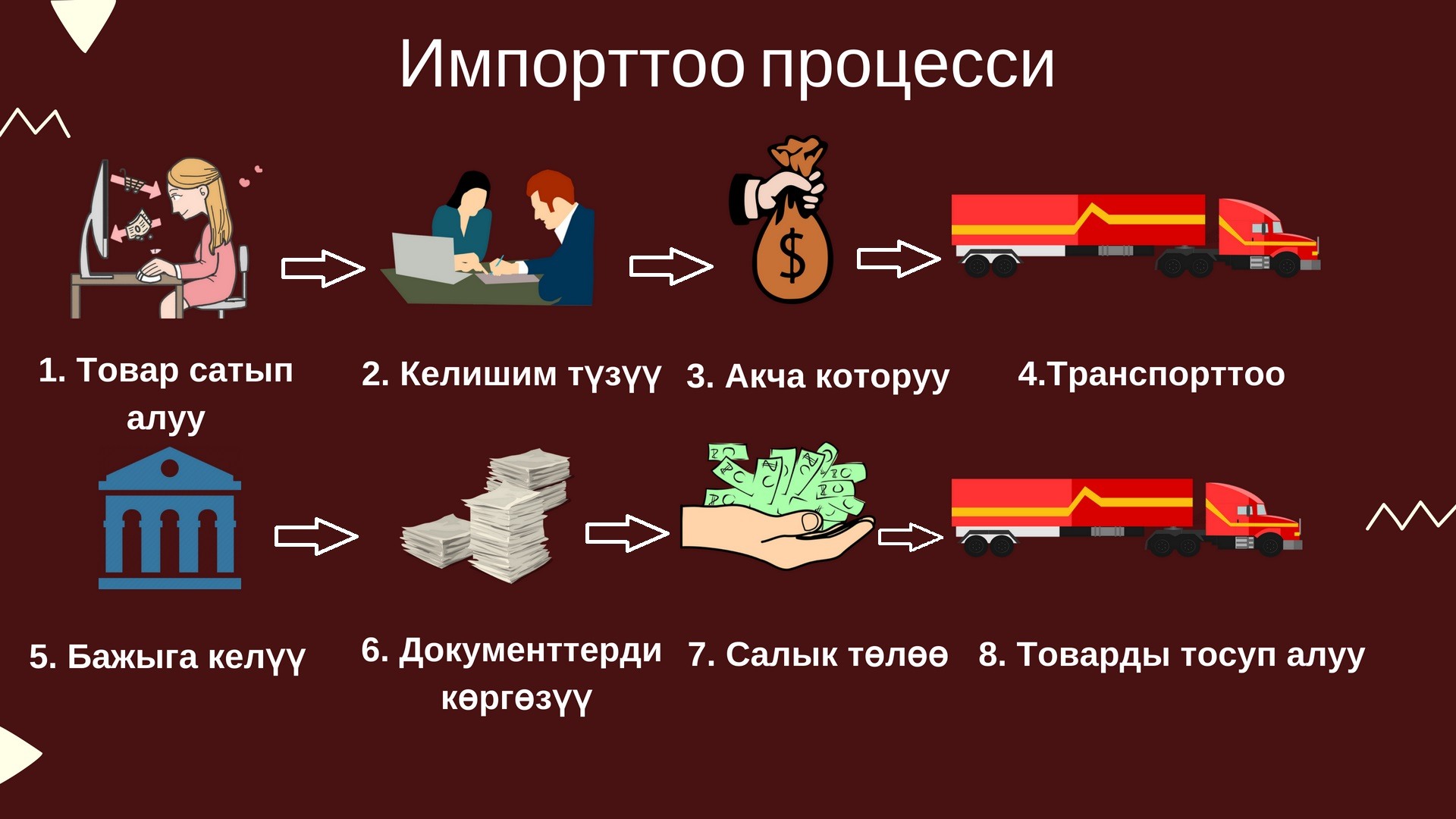 - Биринчи кезекте — бул товар алуу. Акча сатып аласыз, валютаны жөнөтүүчүгө которосуз, баары жакшы болсо, ал товарды жүктөп, жөнөтүүнү баштайт. Алар менен келишим түзүп, кол коюшуңуз керек. (юристтин көзөмөлүндө)