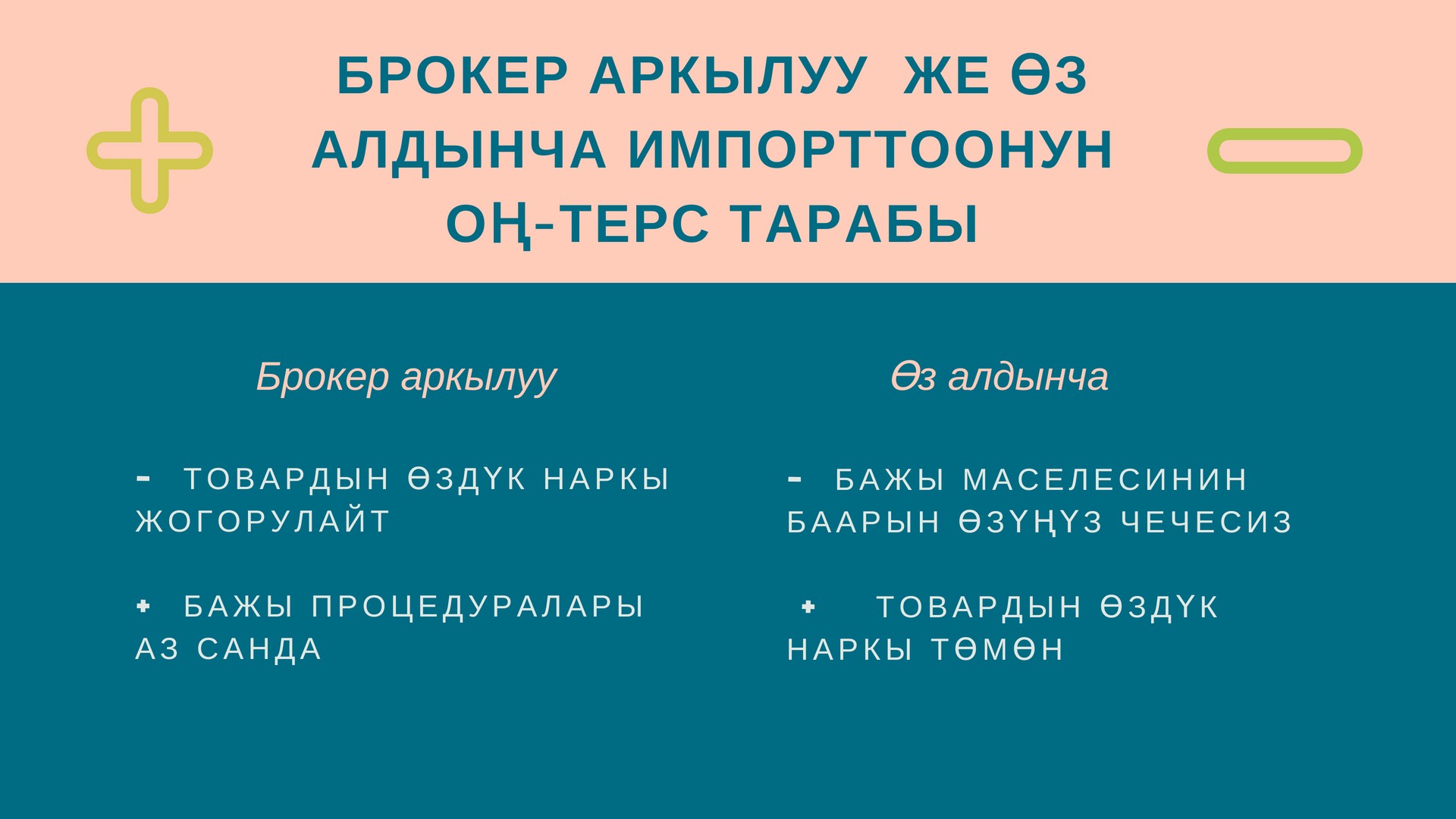 Транспорттук компаниялар дагы бар. Алар брокердик кызматтан тышкары товарды сиздин кампаңызга чейин жеткирип берүү кызматын көрсөтүшөт. Өзүм импорттобойм десеңиз, дал ушундай брокер кызматы бар транспорттук компанияга кайрылганыңыз туура. Кызматтын баарын бир жерден ала аласыз. Ошондой эле товарды жөнөткөн чет өлкөлүк ишканага акча которбой койсоңуз дагы болот. Баардык документтерди транспорттук компания түзүп берет, сиз акча гана берип коёсуз. Алар өзүнө тиешелүү комиссия алып, калганын жөнөтүүчүгө өткөрүп, товарды Кыргыз Республикасынын аймагында алып келип берет.