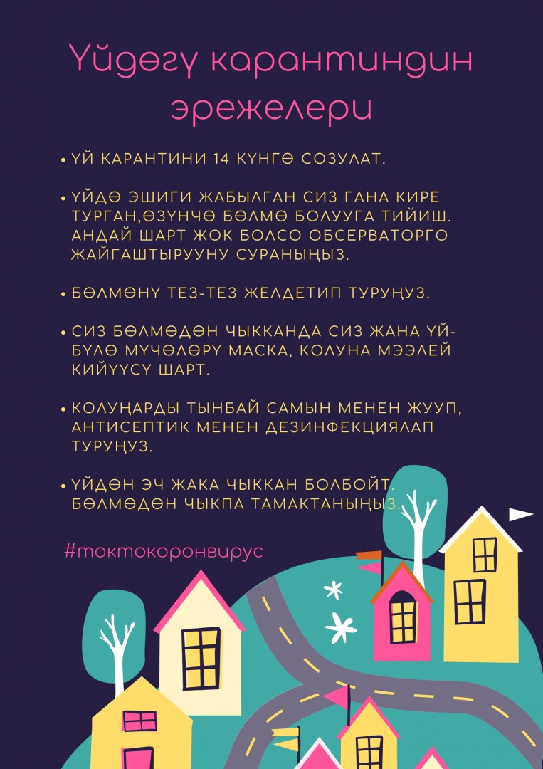 Үй карантини — коронавирус илдетине каршы күрөшүүнүн бирден бир шарты. Бул эрежелерди сактоо менен, өзүңүзгө жана жакындарыңызга кам көрө аласыз.