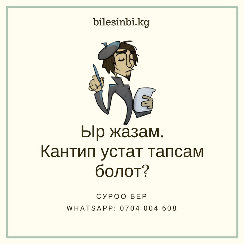 15 жаштамын. Ыр жазам, буйруса акын болгум келет. Акындар чыгармачылык жаатына азыртадан кошулсам деген тилегим бар. Жеңишбек Жумакадыр агайдай устат күтүп, анын кеңешин уккум келет. Эмне кылсам болот?