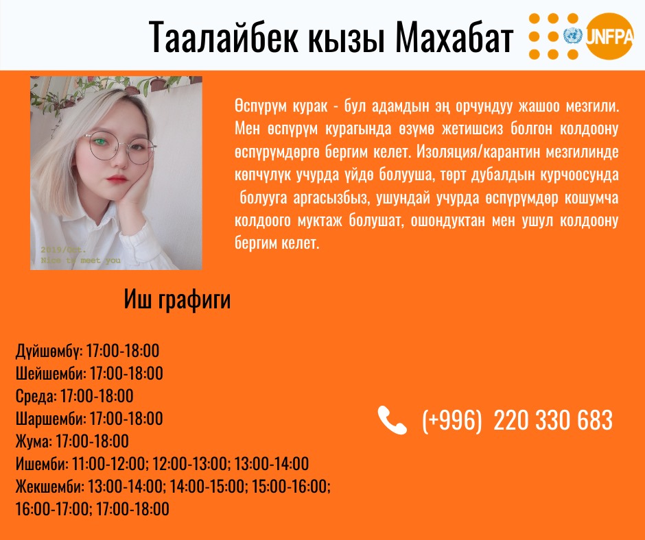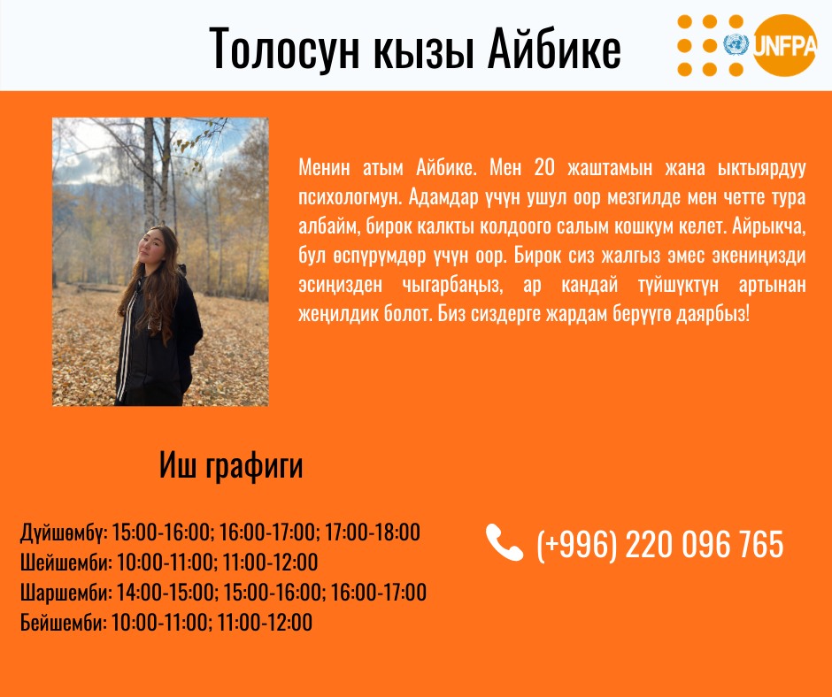 Ушуга байланыштуу, ЮНФПА Bilesinbi.kg онлайн платформасы жана психологдордун колдоосу аркылуу өспүрүмдөрдүн психикалык ден-соолугун чыңдоого өз салымын кошууну көздөдү.