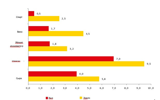 Эсептелип чыккан маалыматтарга таянып, аз гана сандагы өспүрүмдөр ичимдикти 9 жашында же андан эрте татып көрөрү маалым болгон. Алар баарынан көп шампанды, божомолдоолор боюнча майрамдарда үй-бүлөлүк салт катары (2,4%) жана сыра (2,1%) ичишкен. Биздин өлкөдө ичкиликти алгачкы жолу эң көбү 16 жаш жана андан улуу куракта татып көрүшөт.
