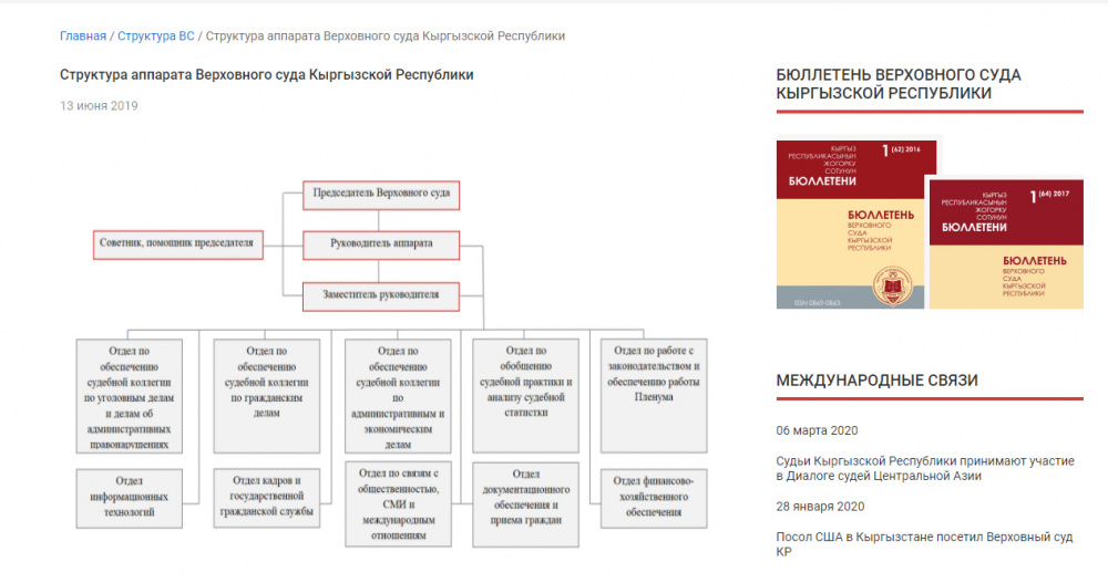 Эгер бөлүмдөрдү жакшылап бассаң, башкача пикирде каласың. Сайтта Жогорку соттор, жетекчилик жөнүндө маалыматтар, судьялардын тизмеси, жергиликтүү соттордун даректери жана соттордун тизмеси менен шилтемелер бар. Жогорку соттун судьяларында гана өмүр баян бар.