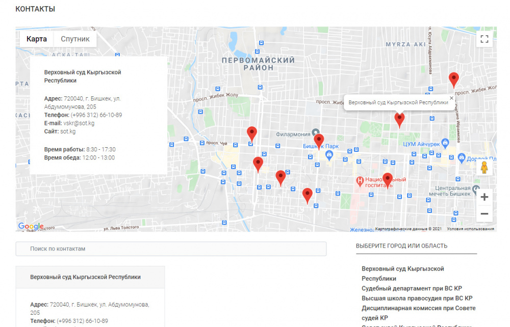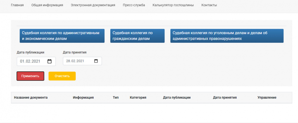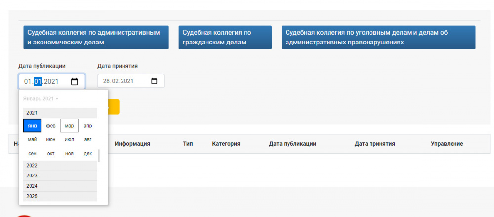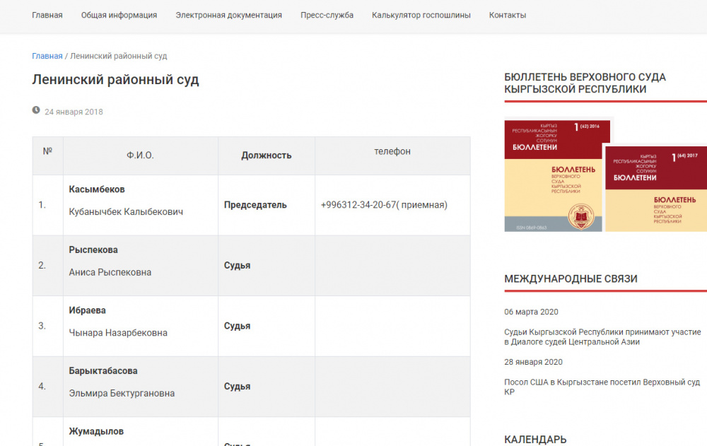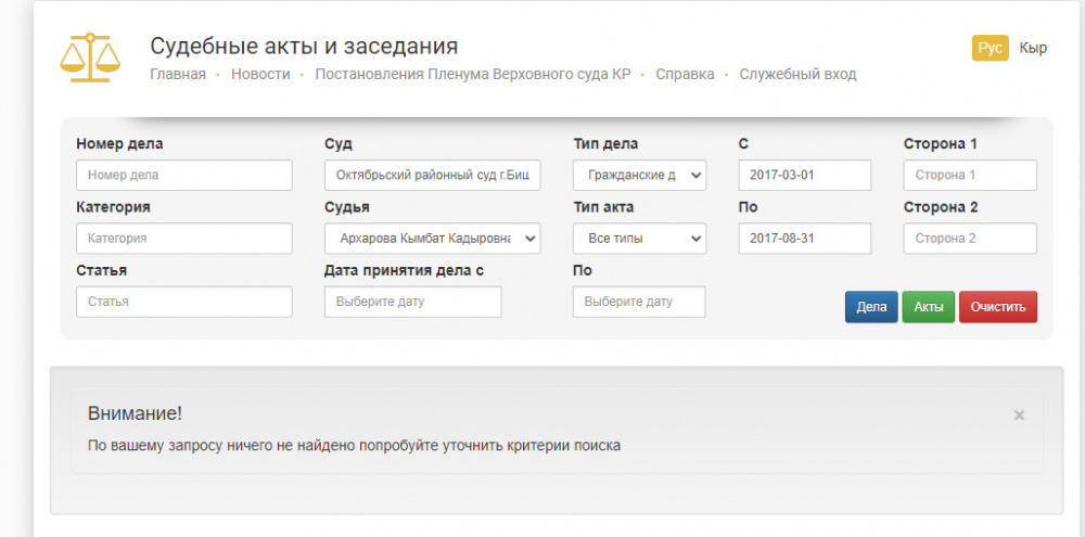 Башкы бетте, оң тилкеде, издөө функциясы менен сот актыларына шилтеме берилген. Эгерде изилдөөчү же журналист болсоңуз жана бир нерсени анализдеңиз келсе, анда маалыматтарды талдоо үчүн IT адисин жалдашыңыз керек, анткени соттун чечимдерин иретке келтирилгенге чейин бир топ күн талап кылынат. 2020-жылы, дал ушундай жол менен биздин редакция судьяларга прокурорлор дайындалганбы же жокпу аныкташ үчүн 4500 соттук актыларды карап чыккан.
