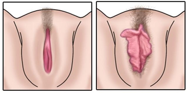 Ошондой эле, кичине жыныс эриндеринин гипертрофиясы тубаса же кийин пайда болот. Салмагы аз, ара төрөлгөн айымдарда көп кездешет. Алгачкы белгилери балагатка жетилгенде, жыныстык жашоо башталганда байкалат.